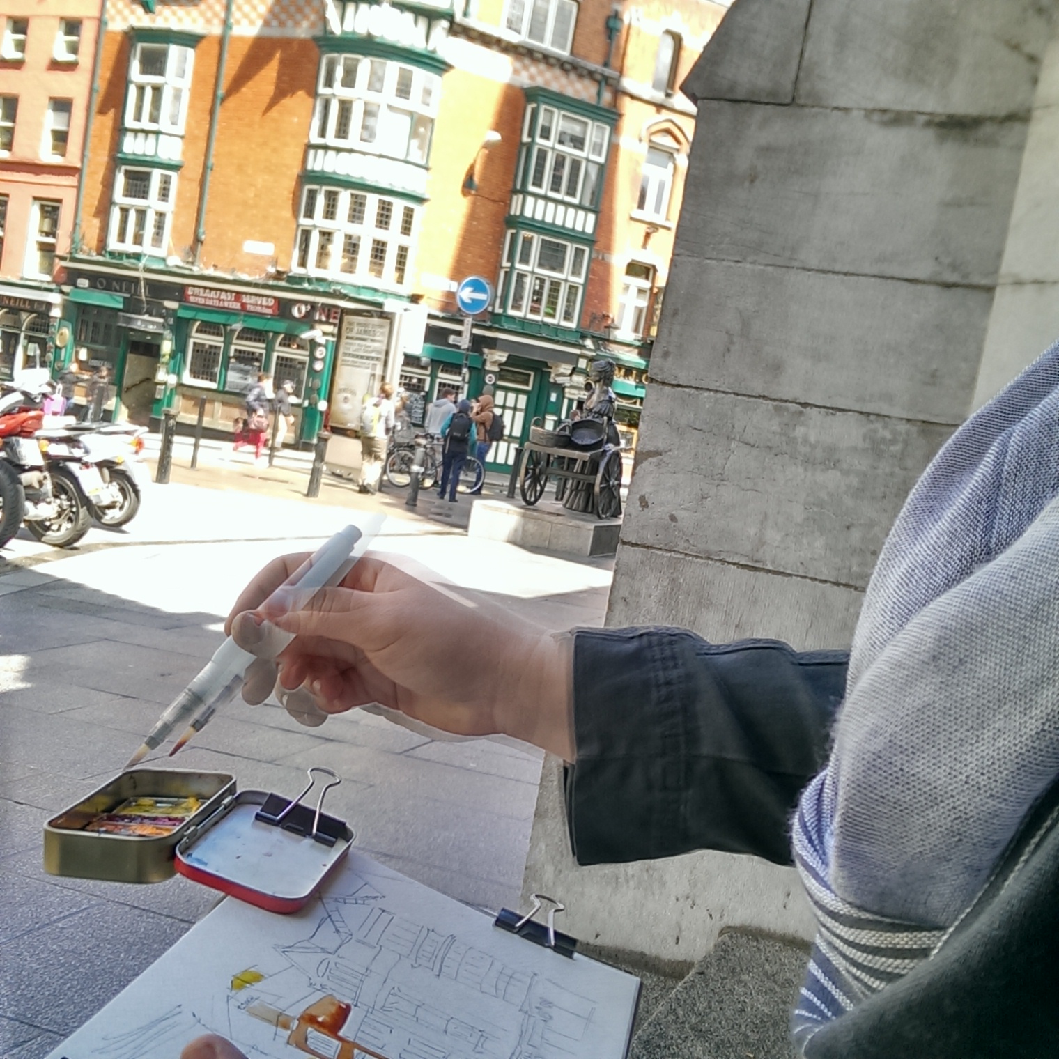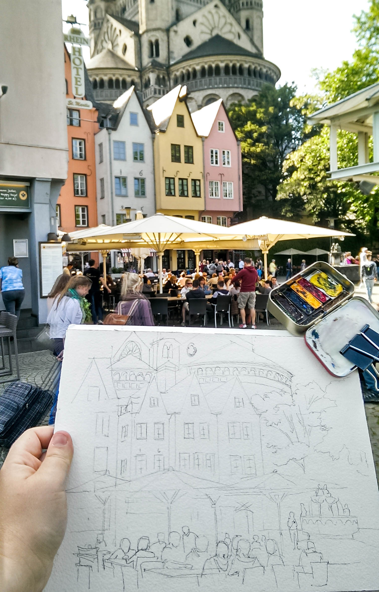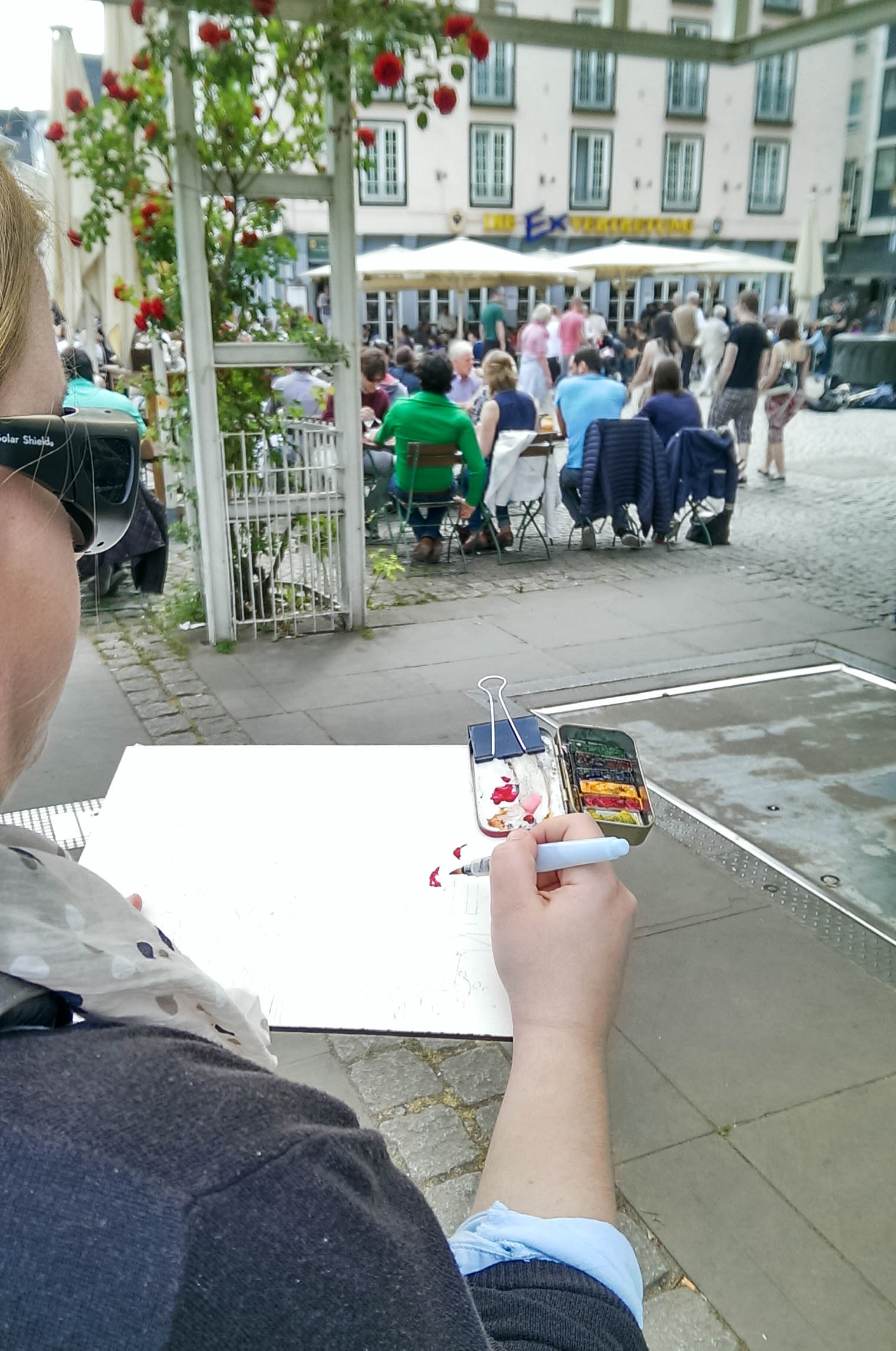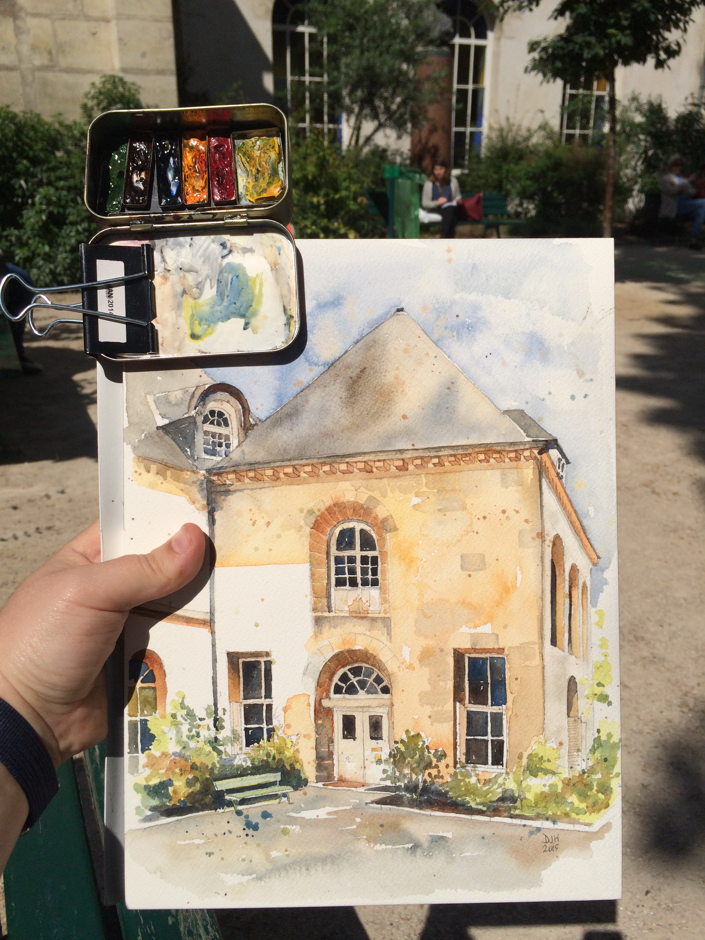 The Altoids tin is clipped onto my watercolor block using a large binder clip. The mixing area on the lid of the Altoids tin is the top of a cottage cheese lid. The metal trays are Almay empty eye shadow tins on top of a refrigerator magnet (magnet is glued to the base of Altoids tin). The metal trays can be removed at anytime to be rearranged, or exchanged for other colors. I use a Medium Sakura Koi Water Brush as my only paintbrush and water source. This brush can be filled with water at home and never leaks. I use a medium size syringe from a drugstore to fill the brush handle with water when refilling on sight. In one painting session, I only need to fill up the brush with water one time.