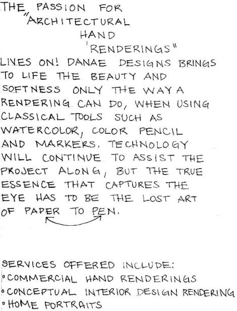 Danae Designs brings to life the beauty and softness only a hand rendering can do when using classical tools such as watercolor, color pencil and markers. Technology will continue to assist the project along, but the true essence that captures the eye is the lost art of pen to paper.